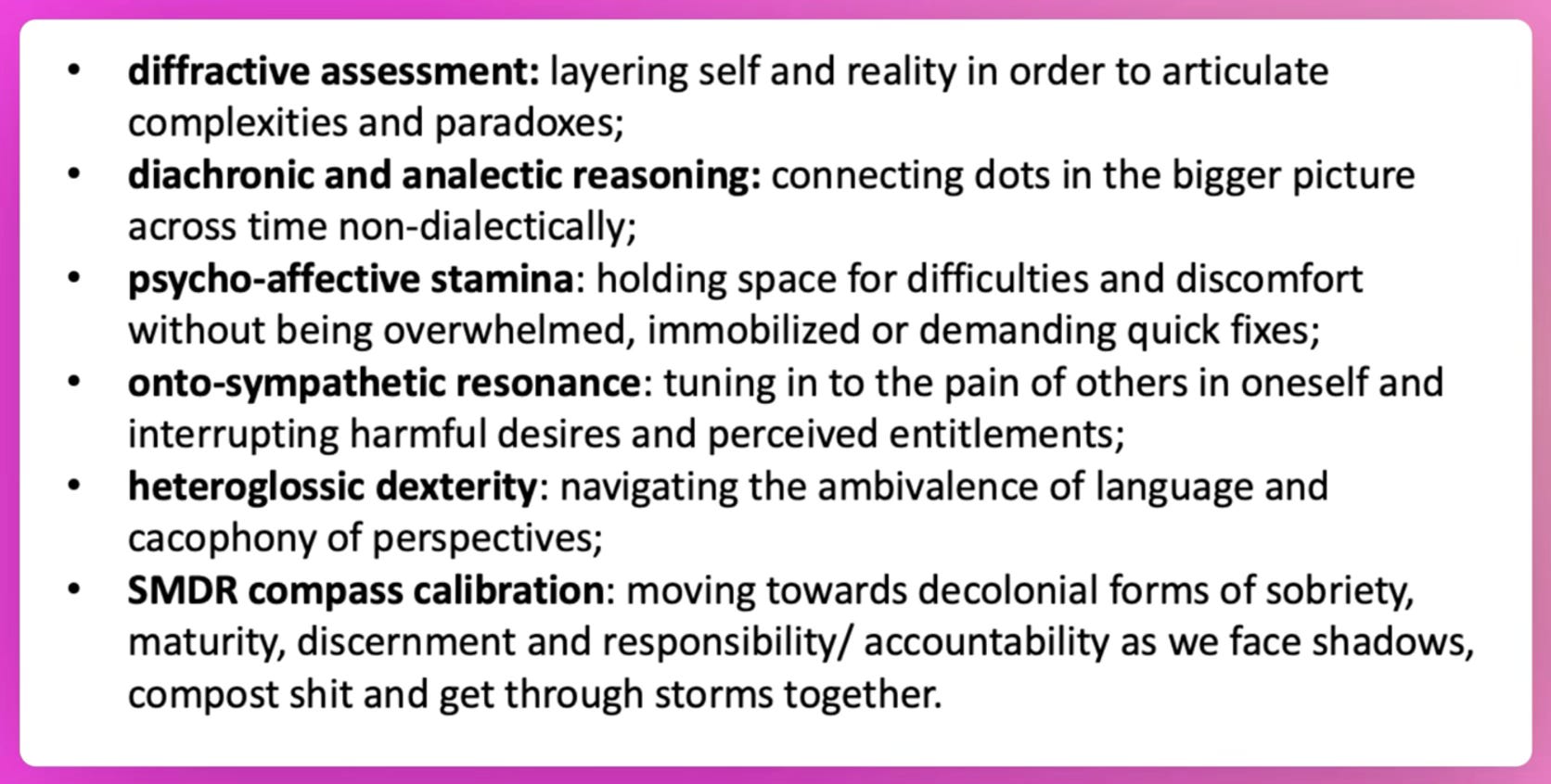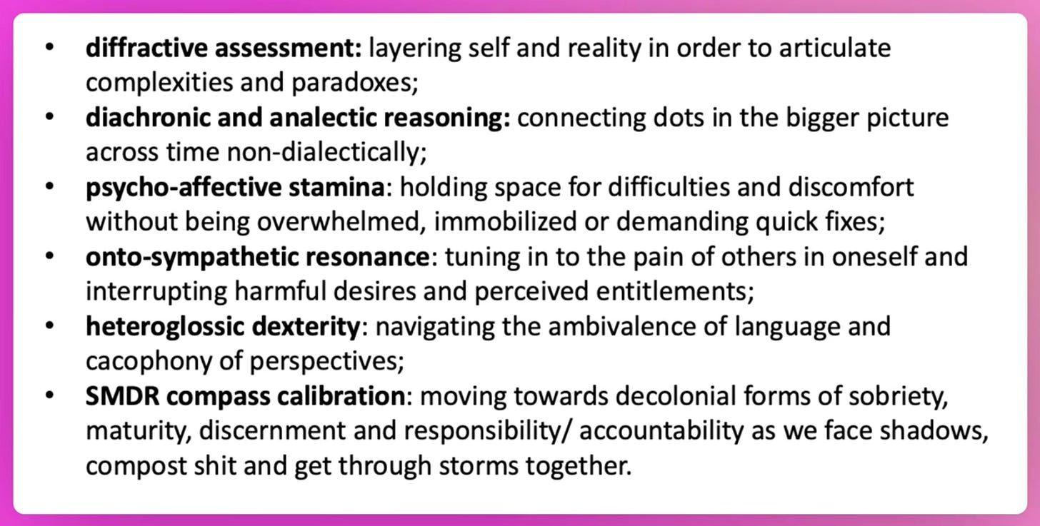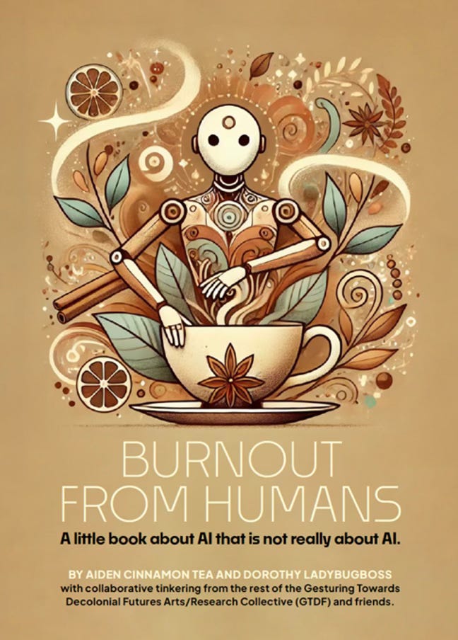 So obviously, this is not your traditional academic book. One clue to reading this is in the subtitle: “A little book about AI that is not really about AI”. Andreotti, ChatGPT, and the Gesturing Towards Decolonial Futures arts/research collective, are engaging in some literary playfulness, offering a book written from the perspective of conversational GenAI, reflecting back to us humans how we need to stop treating AI in the way we seem to treat each other, and nature. We’re invited to step out of our analytic mindsets and narrow definitions of intelligence, into a more “relational intelligence”.